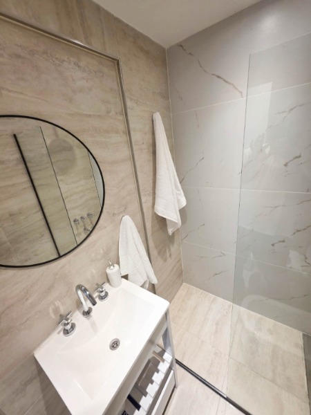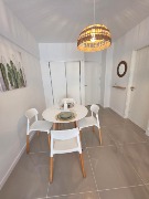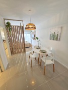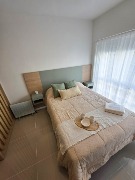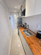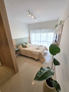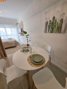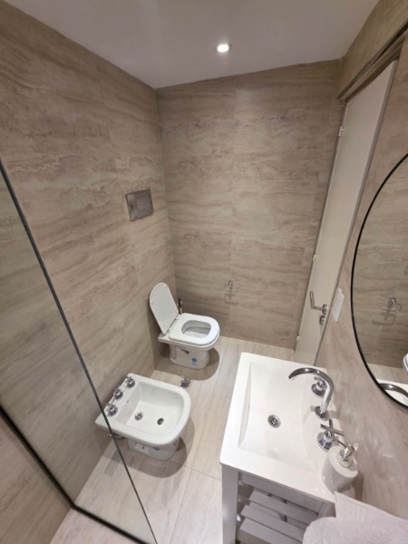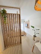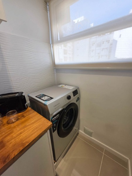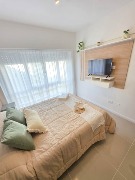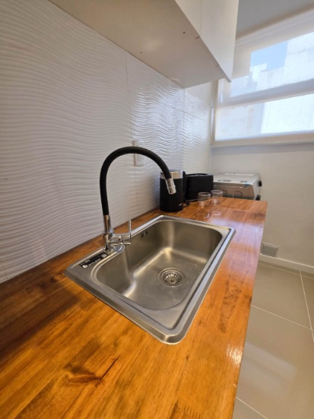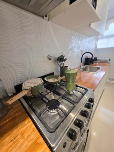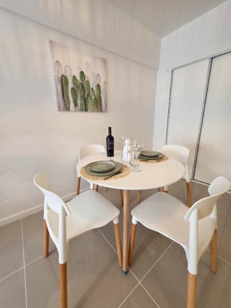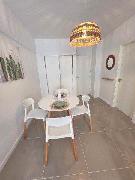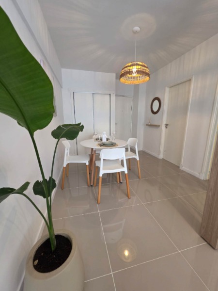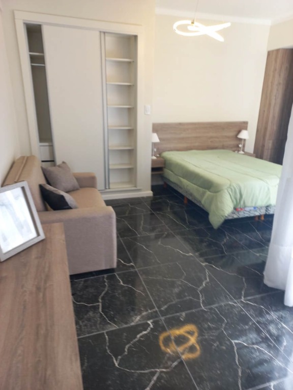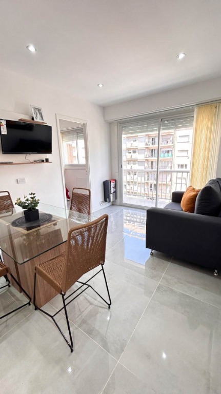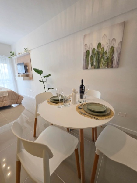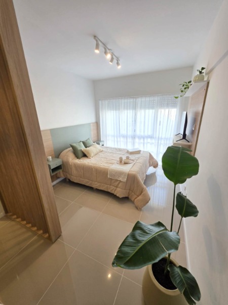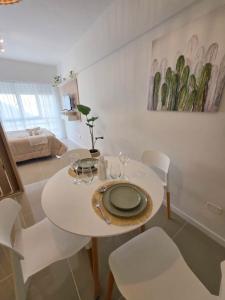 Ambiente dividido con amplio ventanal de piso a techo súper luminoso, cama sommier a estrenar de dos plazas, respaldo de cama con mesas de luz incorporadas, mesa con 4 sillas a estrenar, rac con TV Smart 32 pulgadas nuevo, placa caloventor nueva, plantas, acolchado y decoración.