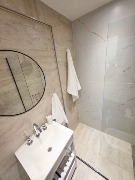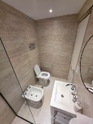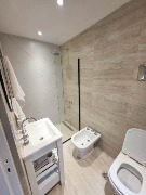Baño completo con mampara, inodoro y bidet Ferrum línea Bari, vanitory madera blanca laqueado, griferia Piaza.