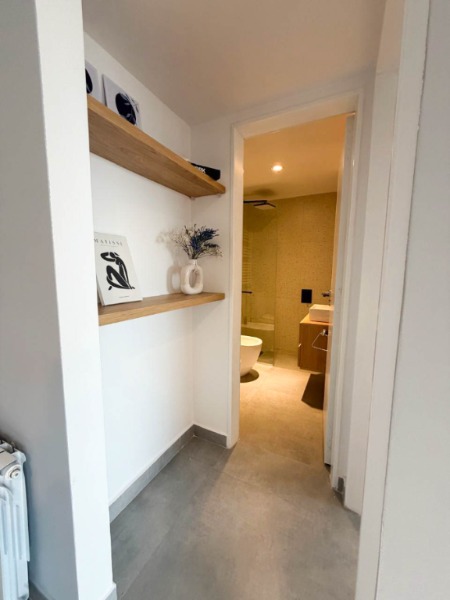 El baño con ducha dispone de doble circulación, con acceso tanto desde el living como desde el dormitorio, brindando comodidad y versatilidad.