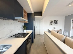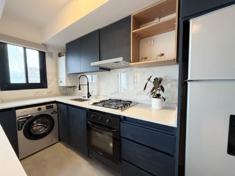 Cuenta con cocina alargada totalmente equipada, con heladera y lavarropas incluidos, integrada de manera práctica al espacio.